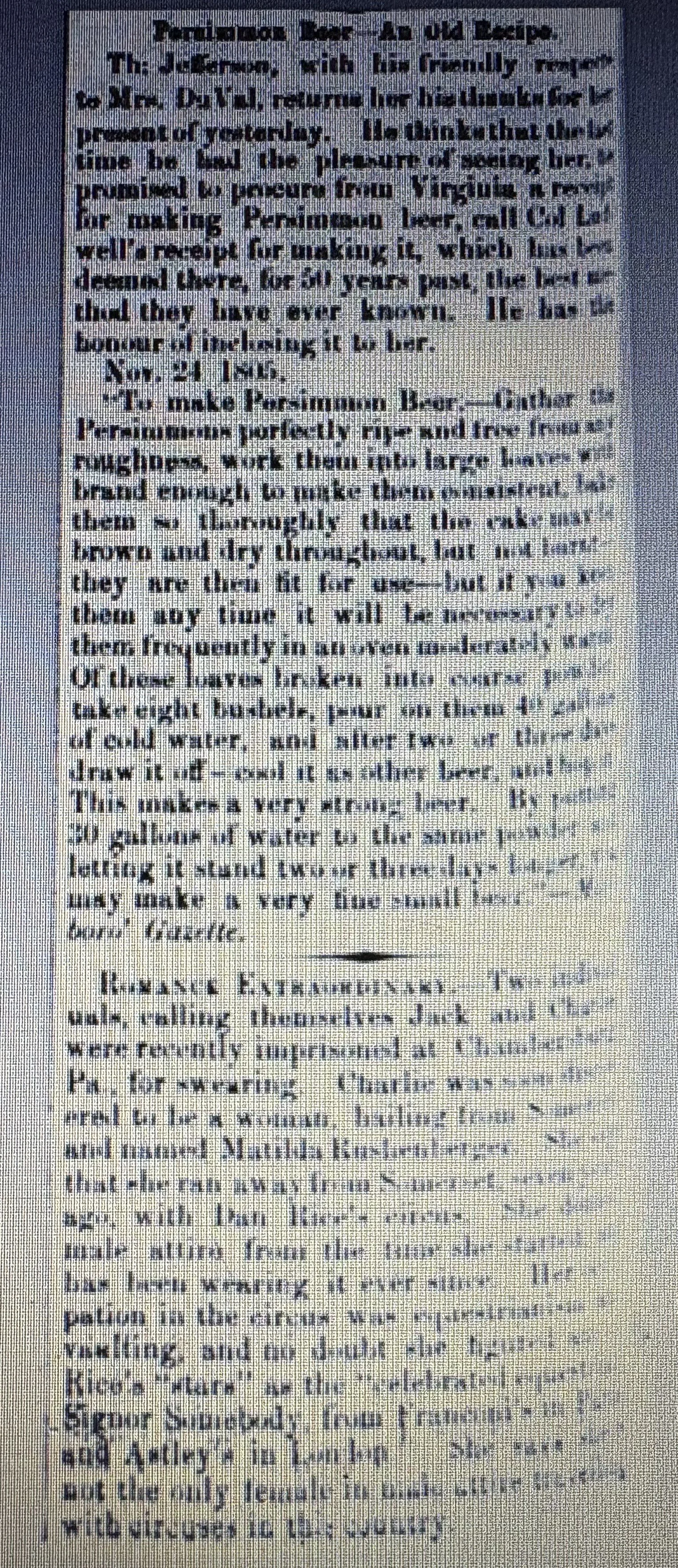 From Lee Graves’ same article comes this quote from a Mr. Nick Waller who was interviewed for the Federal Writers’ Project (USA) in the 1930’s: “That old persimmon beer was half of our living; Us chillun would gather persimmons by the bucketfulls. Mother would cook ’em with wheat bran and make it out into the big pones that she used to make the beer mash and she put lots of [honey] locusts in it. That beer was really good and so refreshin’ after a hard day’s work.”