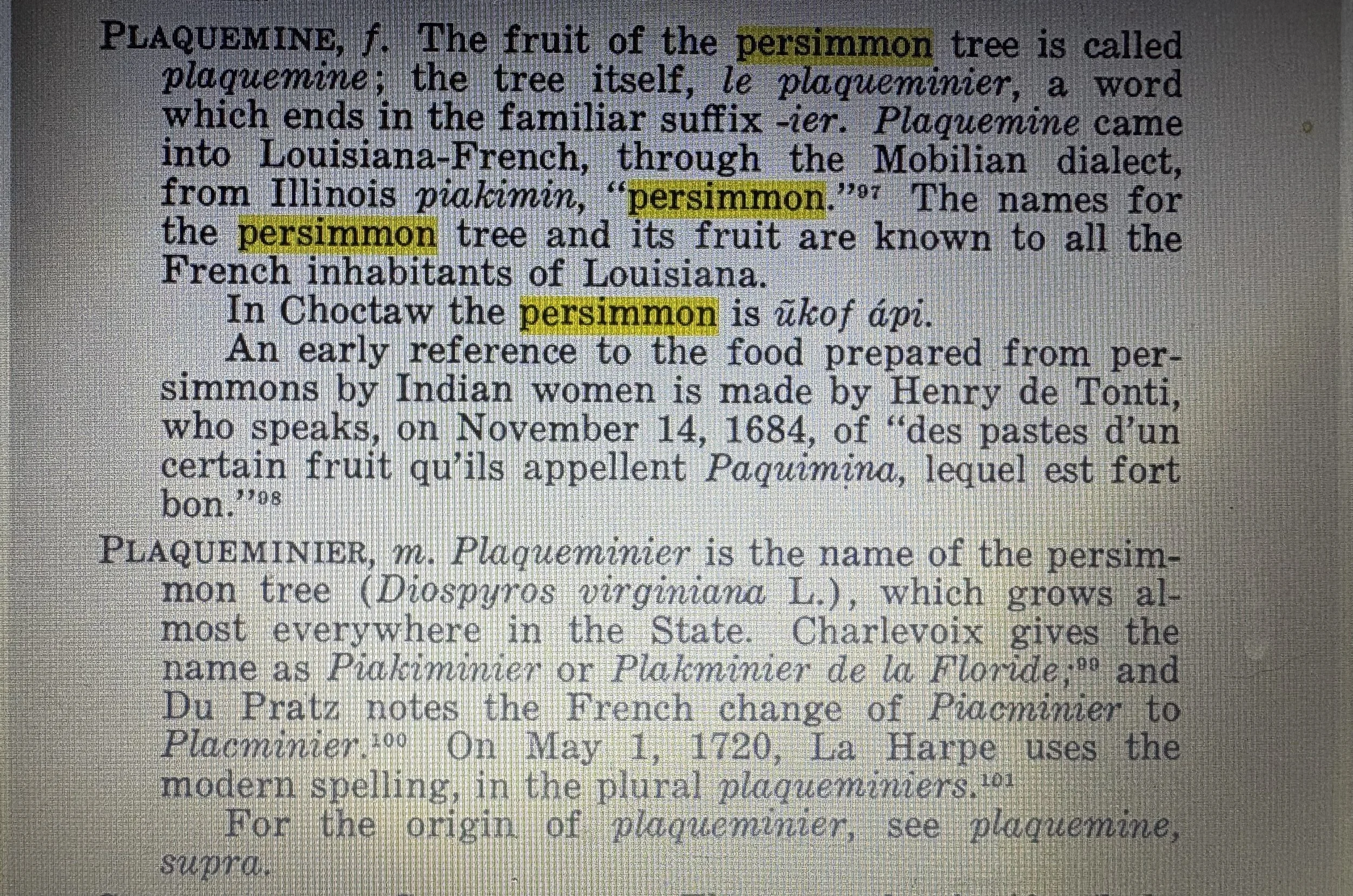 The name persimmon comes from 'putchamin,' a phonetic rendering of the name used by the Algonquin tribe (historically Ottowa River valley area) of the American Indians. Powhatans called it “putchamin;” others, “pessamin” or “pasiminian.” The word Plakemine is a Chitimacha word for persimmon. The town of Plaquemine, Louisiana was originally inhabited by the Chitimacha people and were living there when Pierre LeMoyne, Sieur de Iberville arrived in 1699 and claimed all of Louisiana for King Louis XIV of France. Although according to Flore Louisiane, “the name plaquemine came into Louisiana French through the Mobilian dialect from the Illinois Indian ‘piakimin,’ meaning persimmon.” But then on the Plaquemines Parish marker sign, it states “piakimin” is the Mobile Indian name. “One scientist writing in 1896 said the Native American name translates to ‘choke fruit’—biting into a persimmon before it ripens in the fall will turn your mouth inside out.”