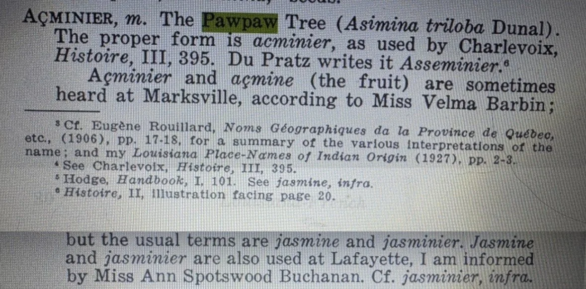But in Cajun Country, you may hear it called “Jasminier" (the tree itself) “Jasmine” (the fruit), or “Aciminier.” The town of Natchitoches, Louisiana, is supposedly named from the Caddo word for pawpaw.
